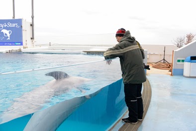 寒いといえども冬に夏用の撮影をするのがこの業界の常識。海沿いのにある施設のイルカちゃんも撮影してきました。皆 完全防備です。私は重ね着しすぎて1.5倍になっていました。