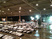 キハダマグロやカジキマグロと次から次へと市場に並らびました。(写真) 昨日の夜もマグロづくしの夕飯で、頰肉の部分なんかとろけるぐらいでした。昼食も定食屋さんでマグロ丼を食べたのですが、ご飯とマグロの割合が逆転してる量で、今年一年はもうマグロ食べんでいいな〜と言いながら帰途につきました。マグロが食べれなくなるかもと言っている時に贅沢な話ですよね〜