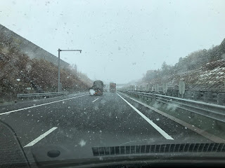 雪がちらつく中、車で東京出張